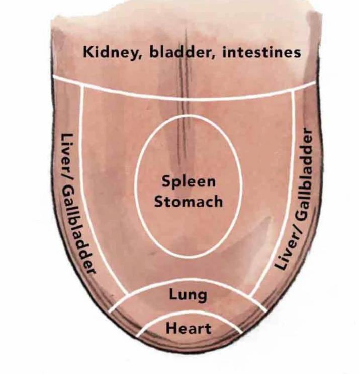 According to TCM, different regions of the tongue reflect different organ systems or energetic zones. Below is a simplified version (please note: this is a broad-brush map, not strict anatomy):